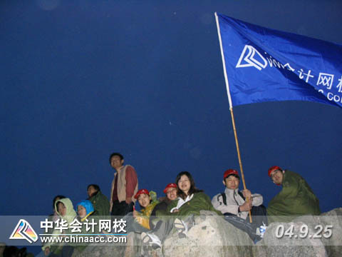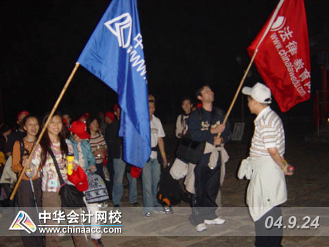 为了追寻日出的光芒,为了体会站在南天门的骄傲,我们一行78人,浩浩荡荡向山上冲去,正保会计网校、法律教育网两面大旗,一红一蓝,招相呼应,引得路人一阵侧目,有人甚至还特意跟上来,想看清旗子上的字,于是我们都会把旗子打开,大声地念给他们听,仿佛这是我们的一种自豪。