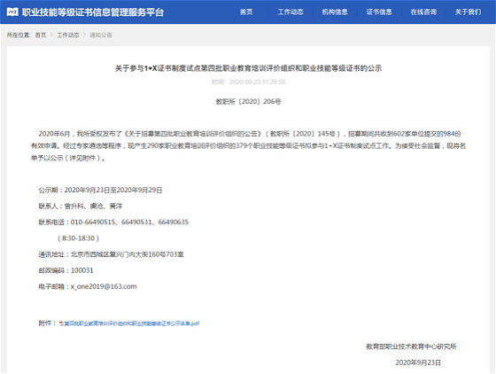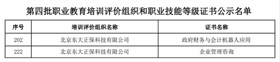 9月23日,教育部职业技术教育中心研究所发布了《关于参与1+X证书制度试点第四批职业教育培训评价组织和职业技能等级证书的公示》。由正保远程教育主体公司北京东大正保科技有限公司联合众多高等院校及行业领先企业共同拟定标准,开发的政府财务与会计机器人应用证书(以下简称:RPA财务机器人证书)、企业管理咨询证书入围第四批职业技能等级证书公示名单。